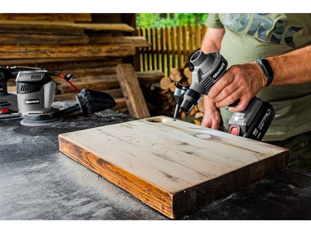 Zariadenie je napájané 18V batériami systému GRAPHITE Energy+, čo poskytuje úplnú voľnosť pohybu pri práci v dielni aj v teréne. Kompaktné rozmery a nízka hmotnosť umožňujú pohodlné držanie aj pri dlhšom používaní.