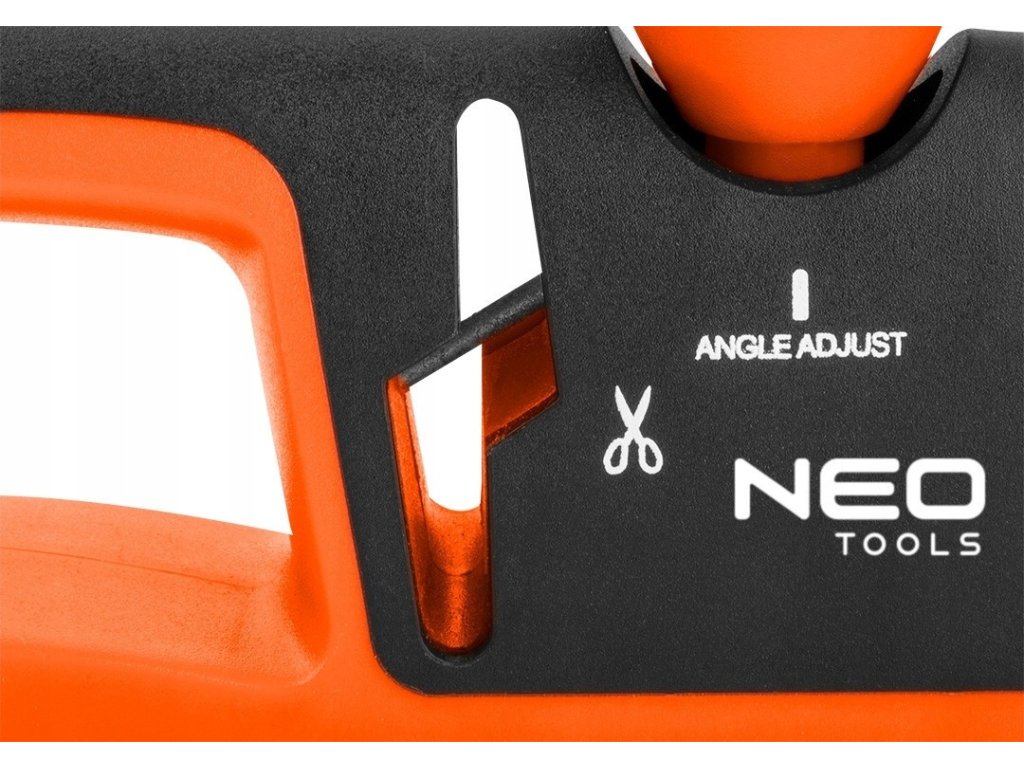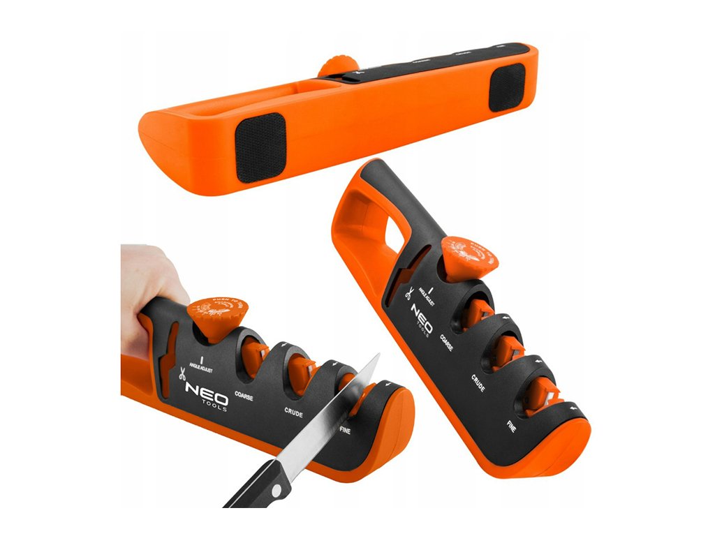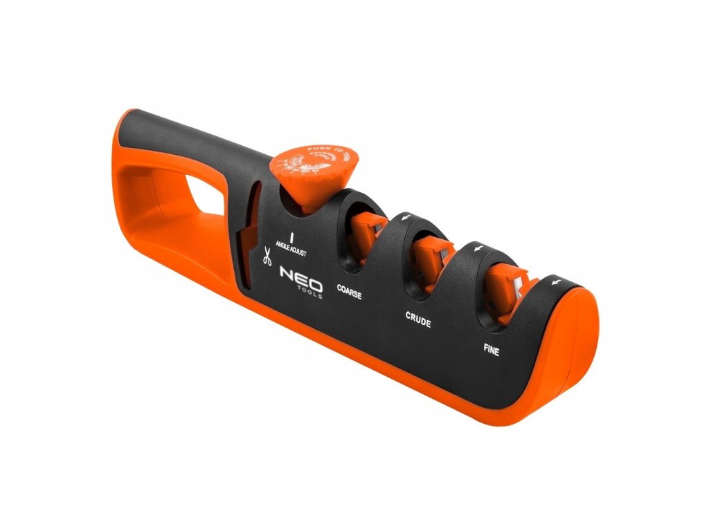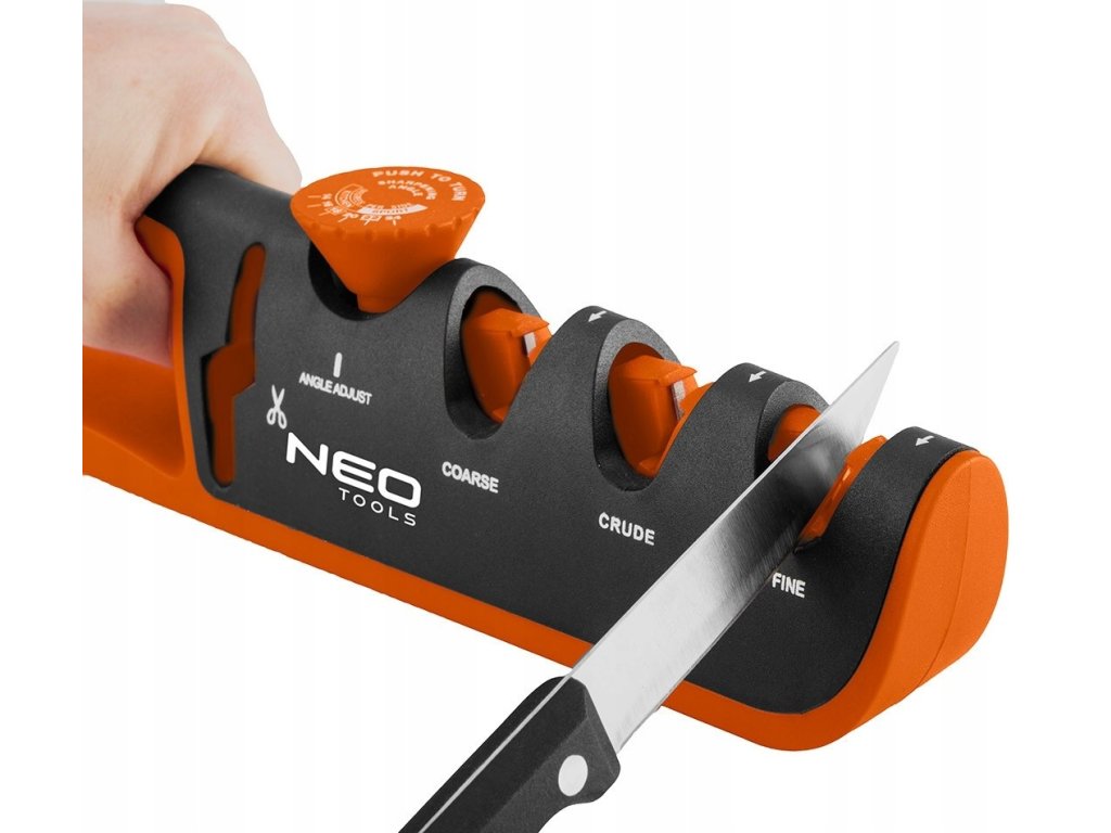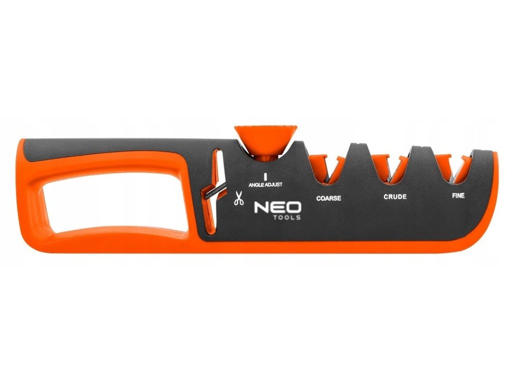 Kvalitná brúska od značky NEO určená na presné ostrenie nožov aj nožníc. Je vybavená trojstupňovým systémom ostrenia – hrubé diamantové brúsenie, tvarovanie ostria pomocou karbidu volfrámu a záverečné leštenie keramickými kameňmi. Na ostrenie nožníc slúži špeciálny diamantový brúsny kotúč.