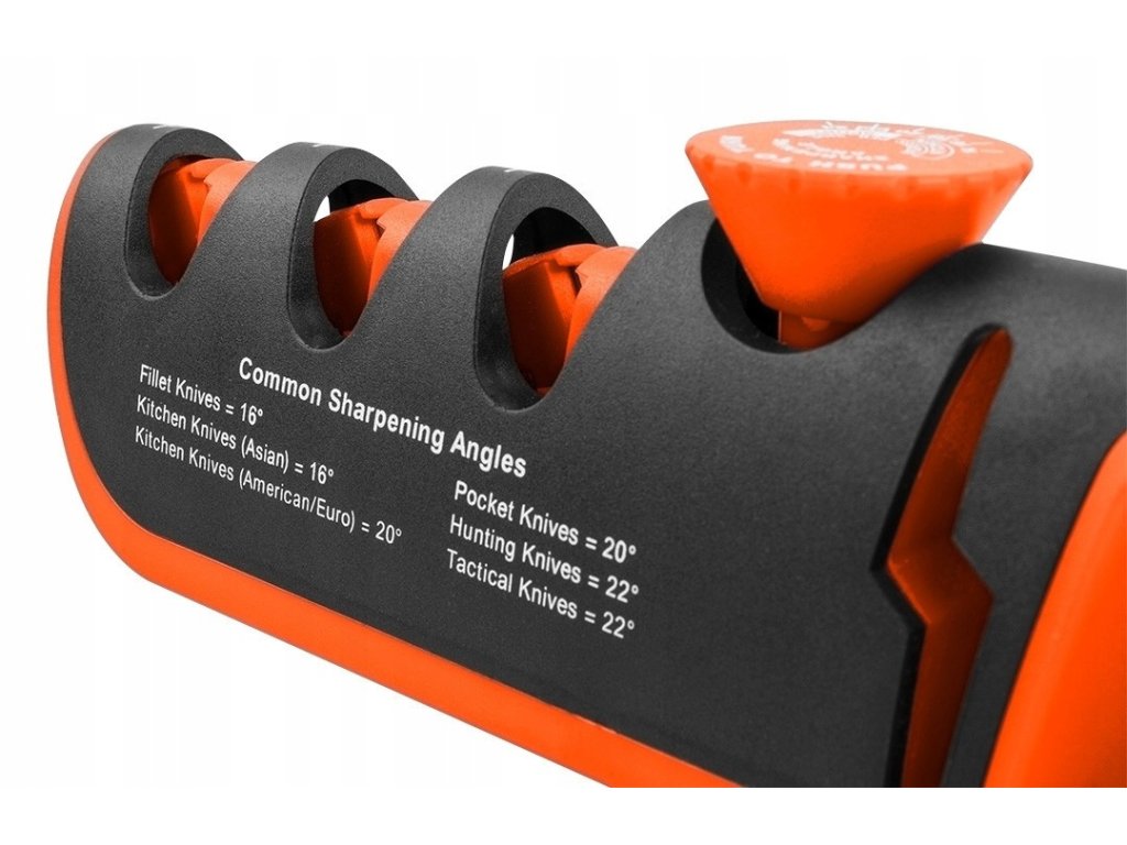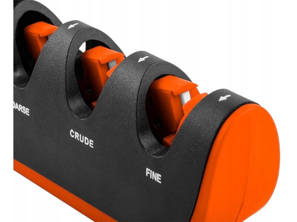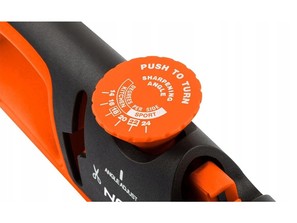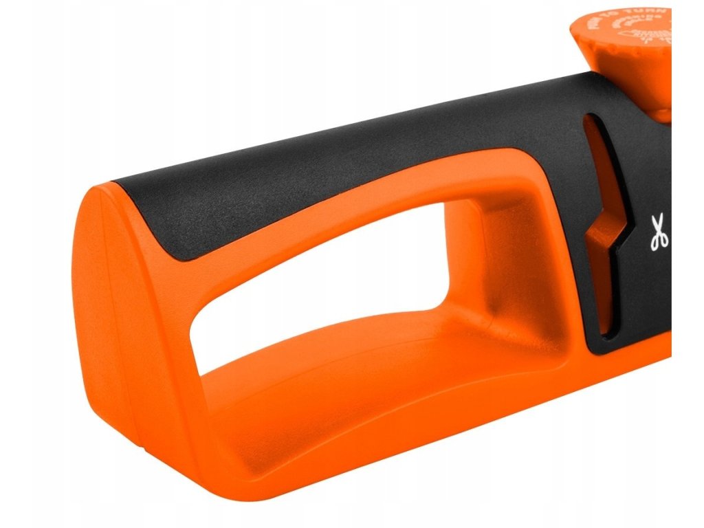 Brúska má nastaviteľný uhol ostrenia pomocou otočného gombíka, čo umožňuje prispôsobiť ostrenie rôznym typom čepelí. Robustné telo z nárazuvzdorného plastu ABC je čiastočne pokryté gumou TPR pre lepší úchop. Stabilitu zaisťuje protišmyková základňa a pohodlie pri práci ergonomicky tvarovaná rukoväť.