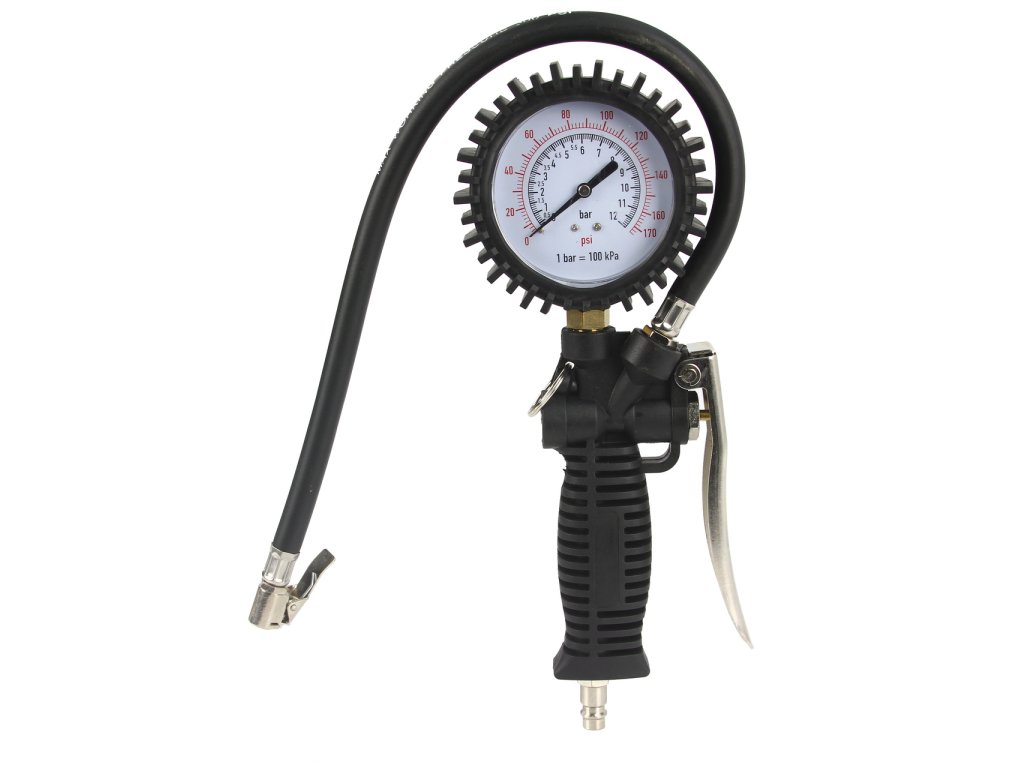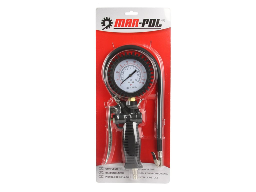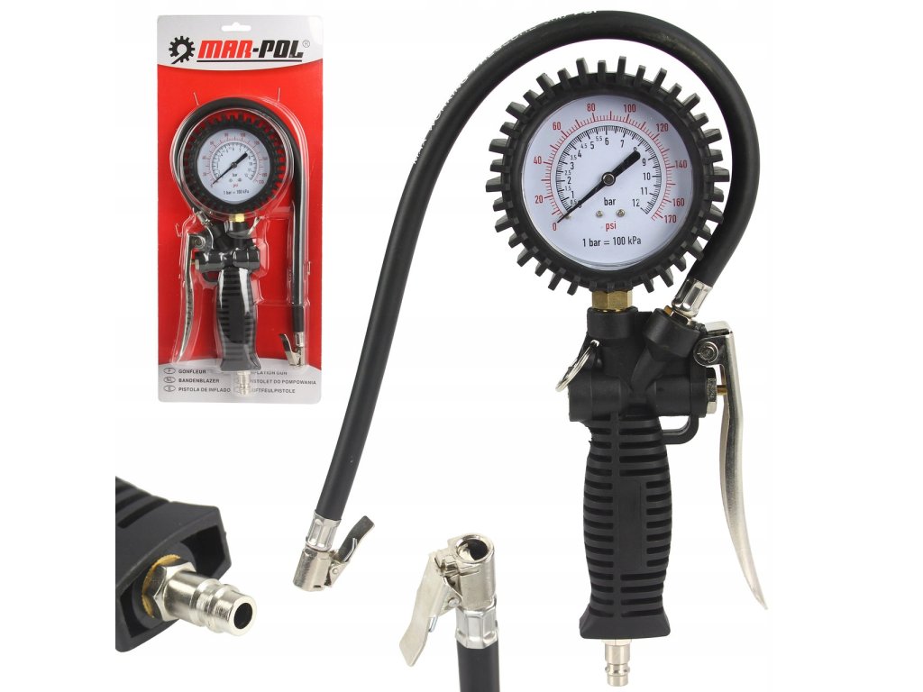 Pištoľ na hustenie pneumatík MAR-POL M80699 je spoľahlivý nástroj vybavený **presným manometrom s rozsahom do 12 bar (170 PSI)**, ktorý umožňuje pohodlnú kontrolu a reguláciu tlaku v pneumatikách.
