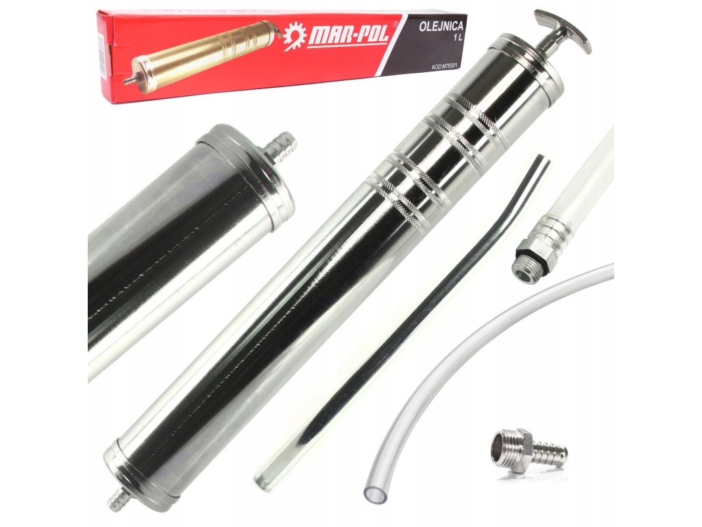 Ručná sacia a odsávacia pumpa na olej a kvapaliny MAR-POL M78301 – 1000 ml, kovová rúrka 24 cm, gumová hadica 30 cm