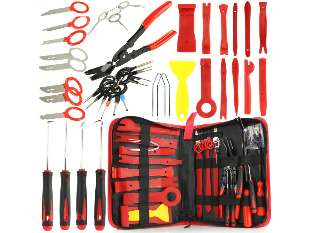 Sada obsahuje široký výber špeciálnych sťahovákov a prípravkov vrátane 22 kusov pre demontáž autorádií, čo z nej robí univerzálny set vhodný pre autoservisy, karosárne aj domácich majstrov.