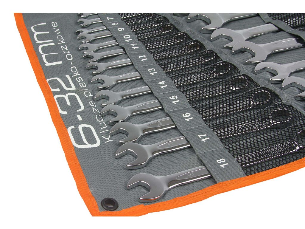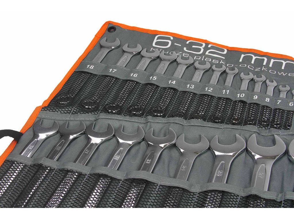 Táto 24-dielna sada kombinuje očkové a vidlicové kľúče vo veľkostiach od 6 mm do 32 mm. Každý kus je vyrobený z chróm-vanádiovej ocele (Cr-V), ktorá je známa svojou pevnosťou a odolnosťou proti opotrebeniu.