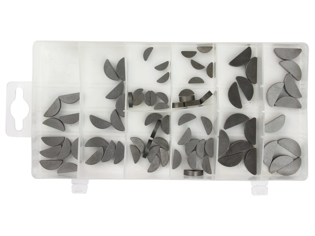Táto sada obsahuje 80 polkruhových klinov v 8 najčastejších veľkostiach, určených na upevnenie a spevnenie mechanických spojov v systémoch so zotrvačníkovými kolesami, kľukovými a remeňovými hriadeľmi. Kliny sú vyrobené z kvalitnej ocele s vysokou pevnosťou, odolnosťou voči opotrebovaniu aj korózii, takže spoľahlivo poslúžia pri opravách či výmene opotrebovaných dielov.