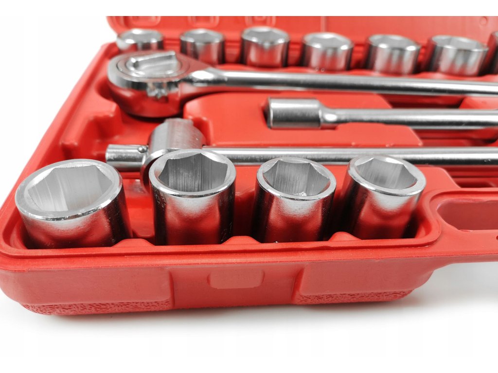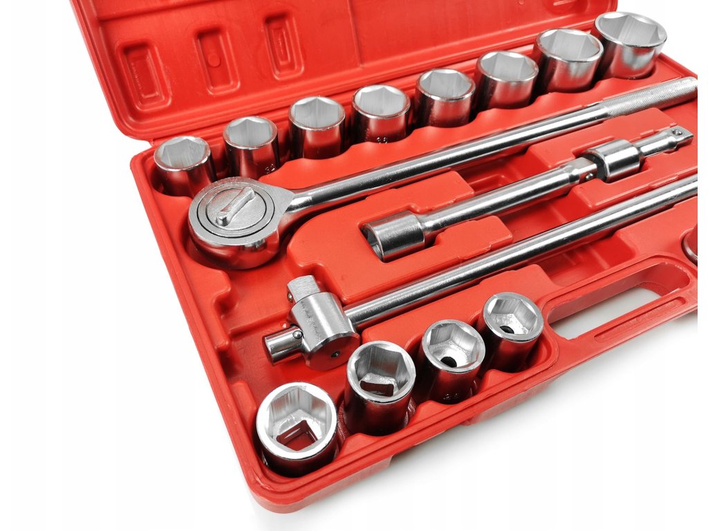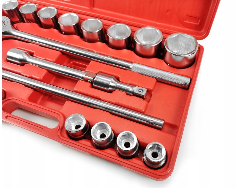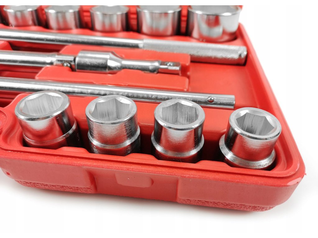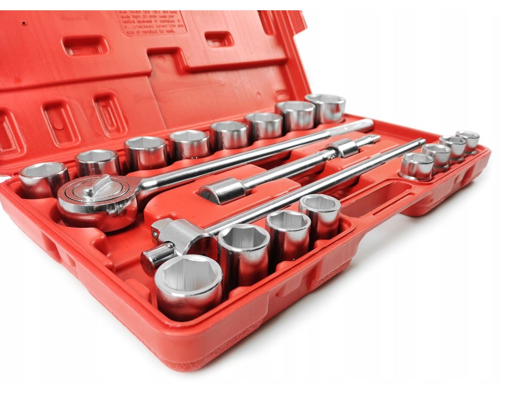 Súprava obsahuje okrem kľúčov aj račňu 3/4", predlžováky a trhák. Všetky komponenty sú usporiadané v praktickom plastovom kufríku, ktorý umožňuje jednoduché prenášanie a organizáciu nástrojov.